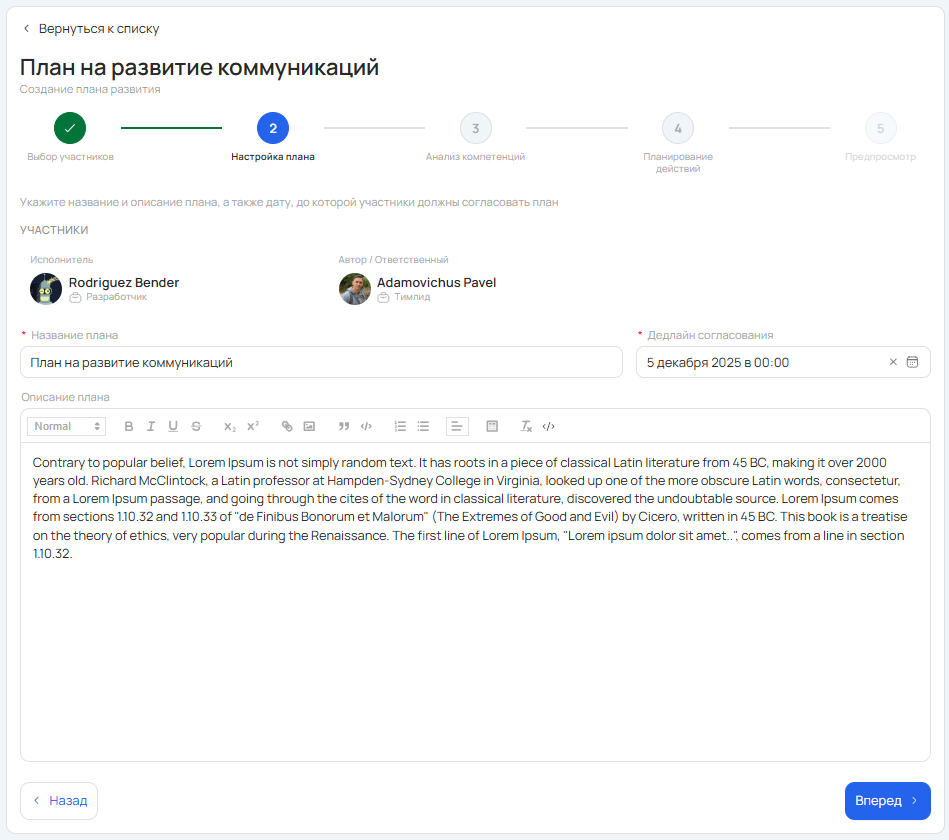 При создании плана необходимо указать название, описание и дедлайн согласования — крайний срок, до которого все участники должны утвердить ИПР.