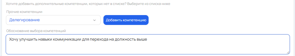 Выбранные компетенции автоматически преобразуются в цели ИПР. При необходимости можно добавить обоснование выбора, чтобы ответственному было понятно, почему именно эти компетенции включены в план.