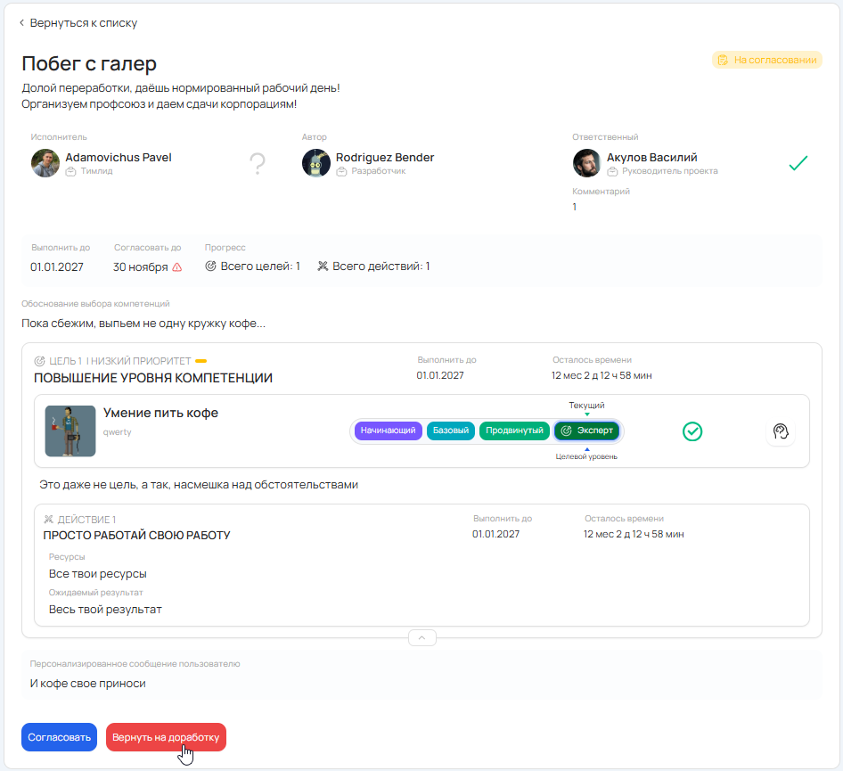 В согласовании участвуют все стороны ИПР: автор, исполнитель и ответственный. Каждый участник может либо согласовать план, либо вернуть его на доработку с комментариями. Если план возвращен, автор вносит правки, после чего согласование запускается заново.
