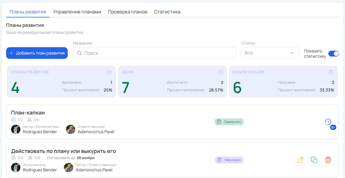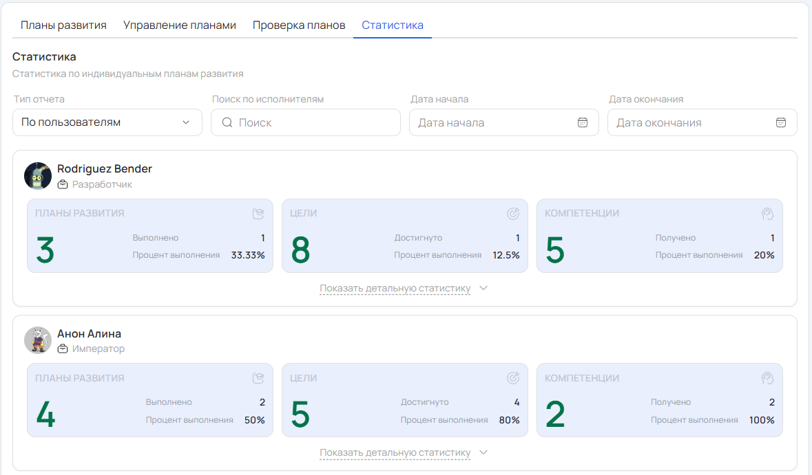 Пользователям с правами проверки доступен раздел «Статистика», где можно анализировать выполнение ИПР: