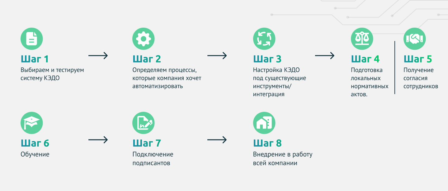 Далее формируется нормативная база. Это локальные акты, положения о КЭДО, порядок использования электронной подписи и согласия сотрудников на переход в электронный формат.