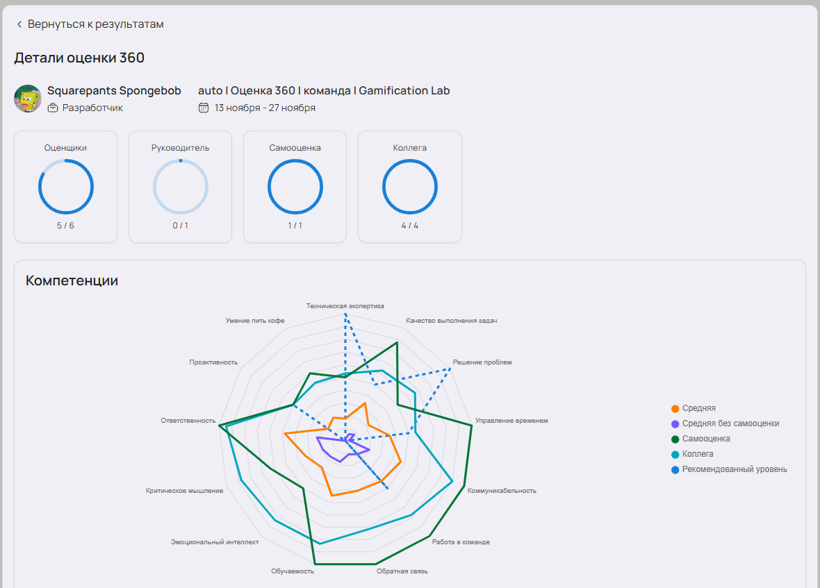 Оценка 360 стала логическим продолжением модуля компетенций, позволяя получать объективную картину профессионального уровня сотрудников.