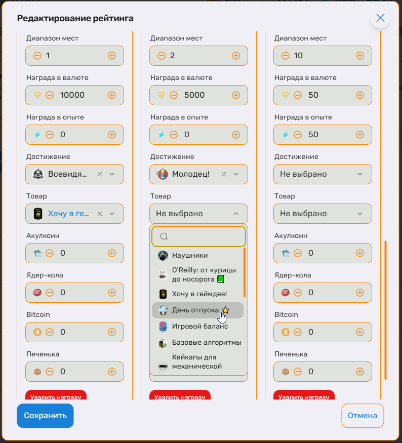 — В наградах реализованы прототипы модальных окон с валютой, опытом и рейтингами.