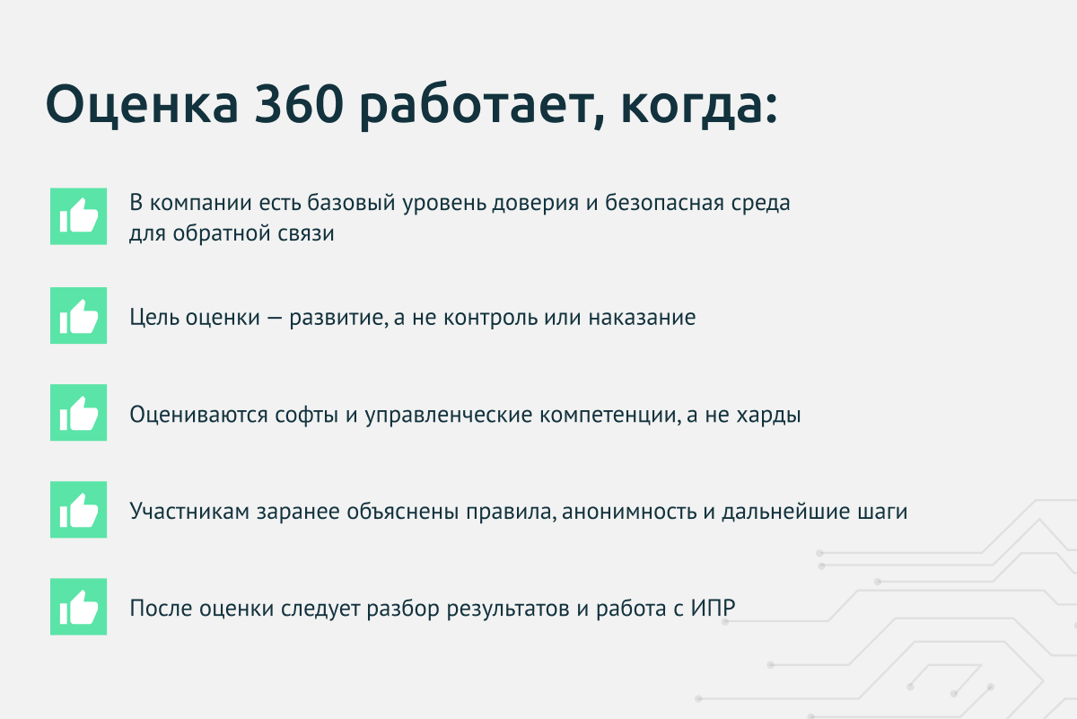 Важно понимать: оценка 360 — это не инструмент контроля или «разбора полетов». Она создается для развития. Когда сотрудники видят, что обратная связь используется не для наказаний, а для роста и поддержки, метод становится частью здоровой корпоративной культуры и усиливает доверие внутри команд.