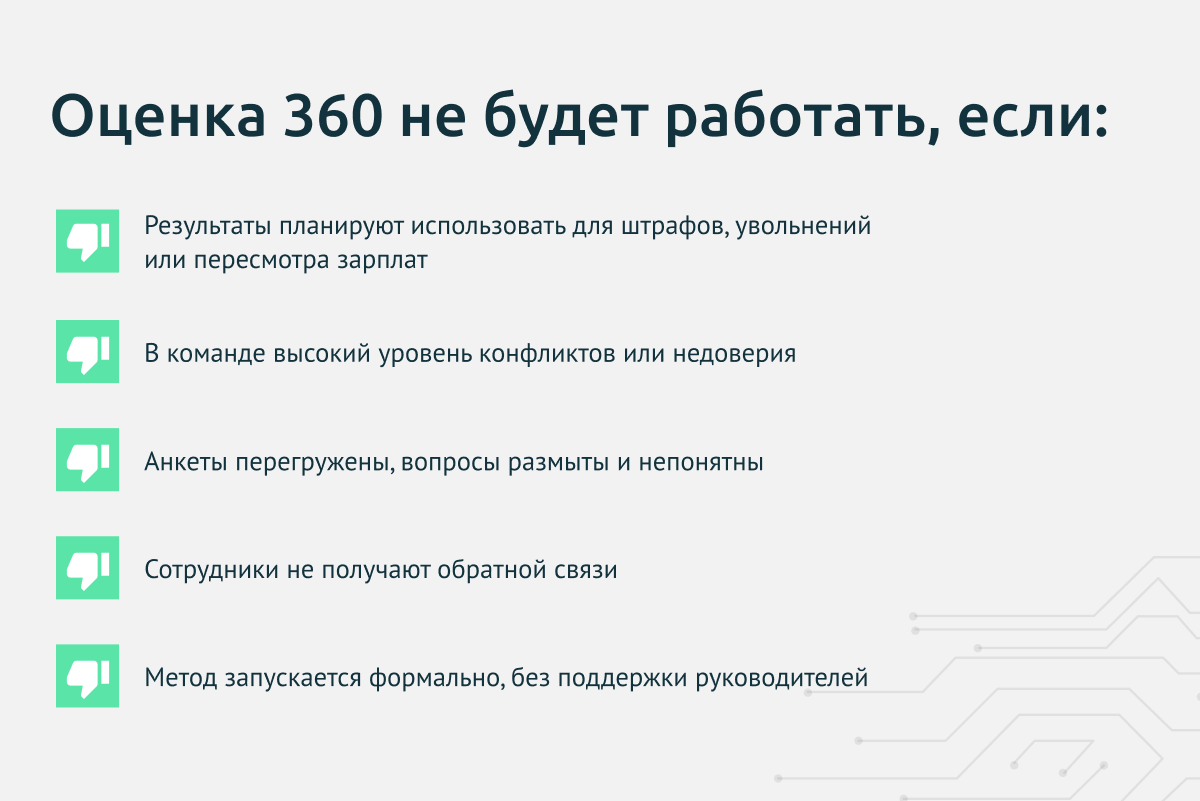 Важно: если цель — наказание или пересмотр зарплаты, метод 360 использовать не стоит.