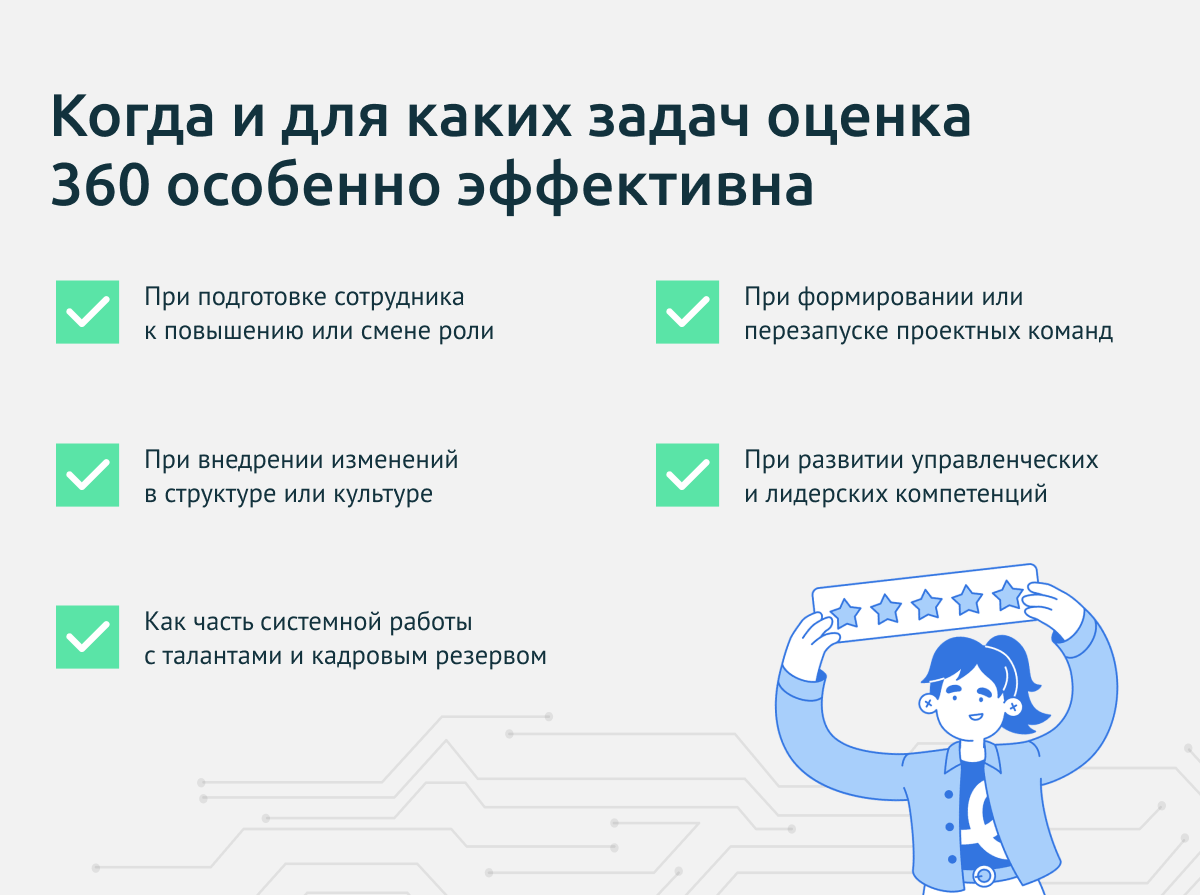 Оценка 360 не заменяет классические HR-инструменты, но решает другую задачу — помогает понять, как именно человек работает с людьми и процессами, а не только что он делает.